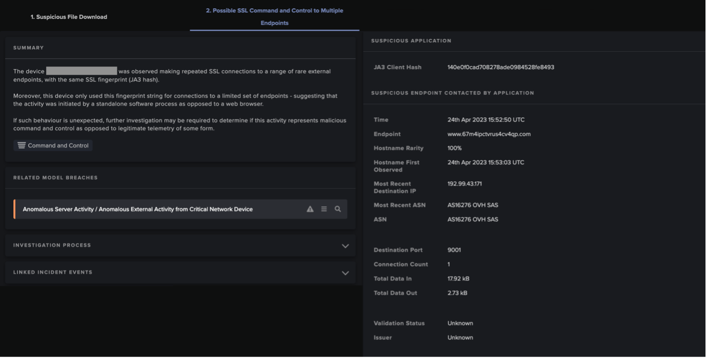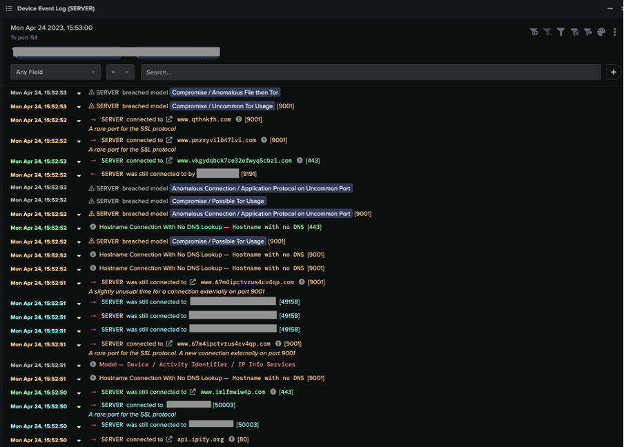 Subsequent C2, beaconing, and Tor connections in the 192.184.35[.]216 chains caused the following Darktrace DETECT models to breach: