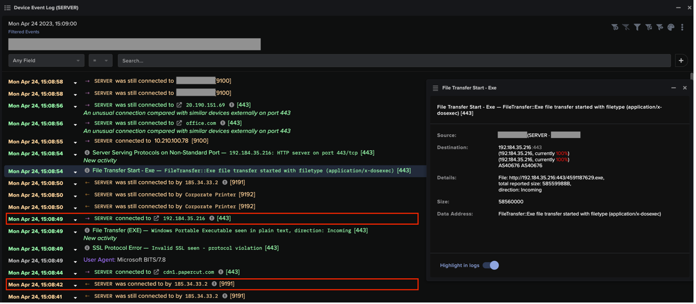 After the exploitation step, the two attack chains took different paths. In the 50.19.48[.]59 chains, the exploitation step was followed by the affected PaperCut server making HTTP GET requests over port 82 to the rare external endpoint, 50.19.48[.]59. In the 192.184.35[.]216 chains, the exploitation step was followed by the affected PaperCut server making an HTTP GET request over port 443 to 192.184.35[.]216.