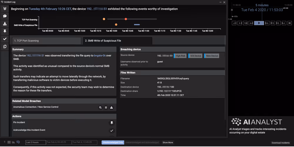 The Cyber AI Analyst immediately began investigating after the first model breach, and continued to stitch together disparate events across the network to produce a natural language summary of the incident, including recommendations for action.