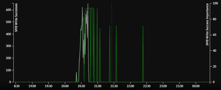 • SMB write successes are observed as the device encrypts files on the network share (shown in gray). The green spikes represent the ‘significance’ of the activity as understood by Darktrace. This pattern of SMB activity represented a major deviation from the device’s normal behavior.