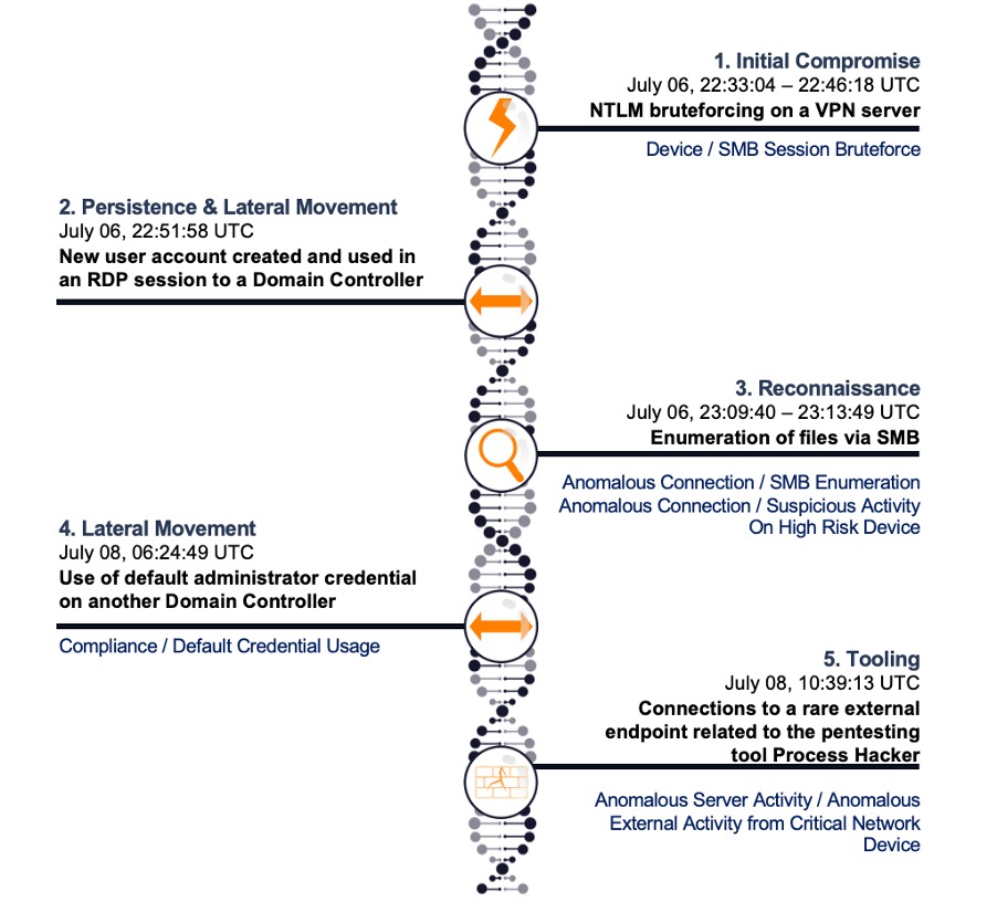 On the 6th of July 2021, multiple user accounts were brute-forced on an external-facing VPN server via NTLM. Notably this included attempted logins with the generic account ‘Administrator’. Darktrace alerted to this initial bruteforcing activity, however as similar attempts had been made against the server before, it was not treated as a high-priority threat.