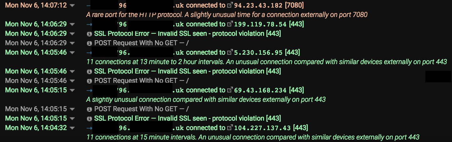We attend to all external connections made by the infected device around the time of the incident and immediately identify more suspicious C2 communication: