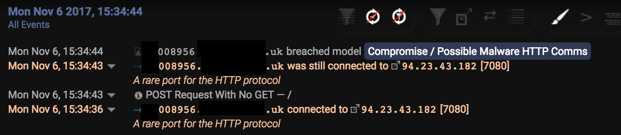 Darktrace came into the environment after the initial infection had taken place already. Darktrace instantly identified several devices exhibiting unexpected HTTP beaconing to unusual, rare external IP addresses. The devices made HTTP POST requests without prior GET requests along other suspicious behavior. Darktrace created several high-severity alerts for this, e.g. ‘Compromise / Suspicious HTTP Beacons to Dotted Quad’ and ‘Compromise / Possible Malware HTTP Comms’: