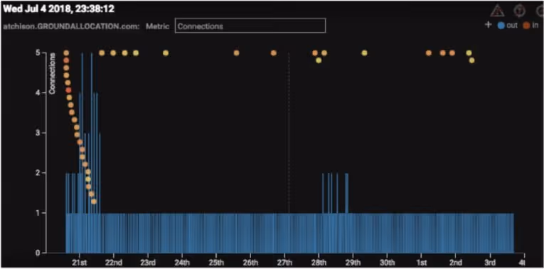 Graph showing all breaching connections from the source device over time, with breaches shown as colored dots. This begins with the download of the masqueraded executable file, and goes up to the present time. The vast majority of these model breaches are likely related to the suspected malicious activity.