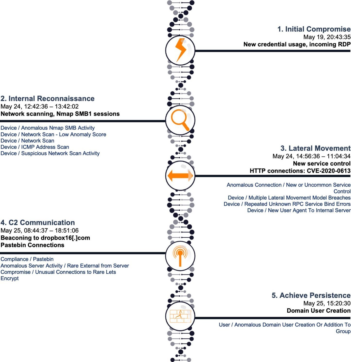 During the two days of reconnaissance and lateral movement activity, these were the only steps Antigena suggested. The steps were all directly relevant to the intrusion – there was no attempt to block anything unrelated to the attack, and no other Antigena actions were triggered during this period.