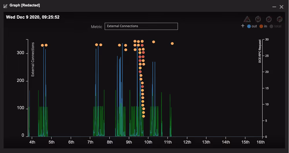 Figure 4: Darktrace reveals the spike in external connections in blue for the device and the DCE-RPC requests in green. The dots represent model breaches triggered by the unusual suspicious activity originating from the device. The external connection spikes match the internal DC-RPC request spikes indicating the device is attempting to move laterally during the C2 connections.