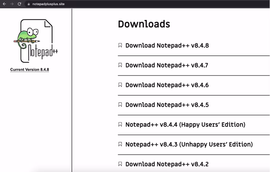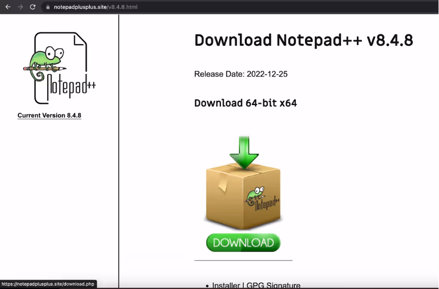 Clicking on the advertisement would direct potential victims to the website notepadplusplus.site, which had been registered on the 4th of January and is hosted on IP address 37.140.192.11. Upon selecting the desired version of the software, a download button is presented to the visitor.