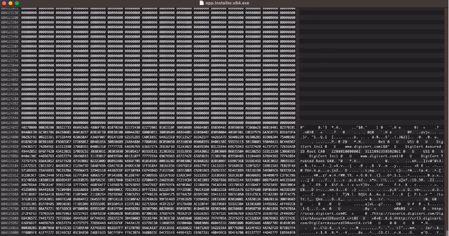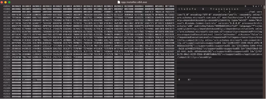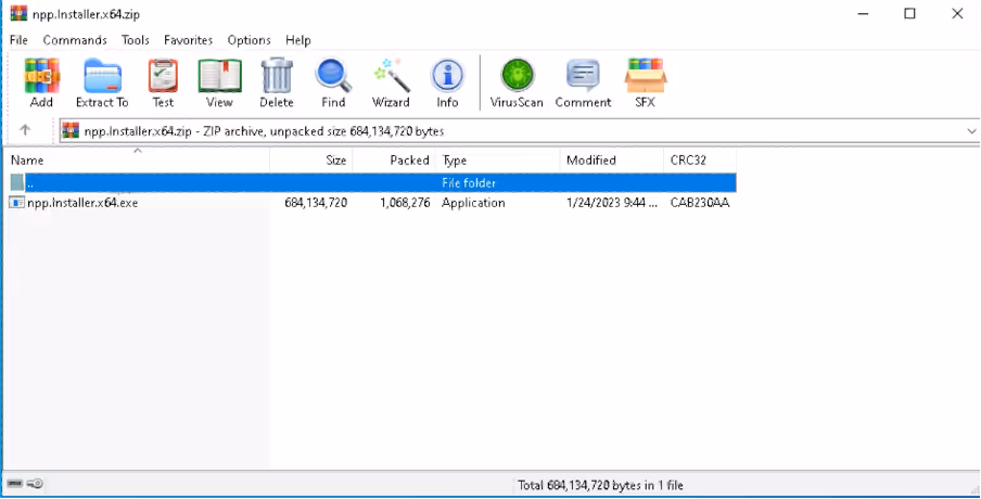 Upon extraction, the file "npp.Installer.x64.exe" has a file size of 684.1 megabytes. The significant size is attributed to the inclusion of an excessive number of null bytes, which serve to prevent the file from being scanned by some Antivirus and uploaded to malware analysis platforms such as VirusTotal, which has a file size limit of 650 megabytes.