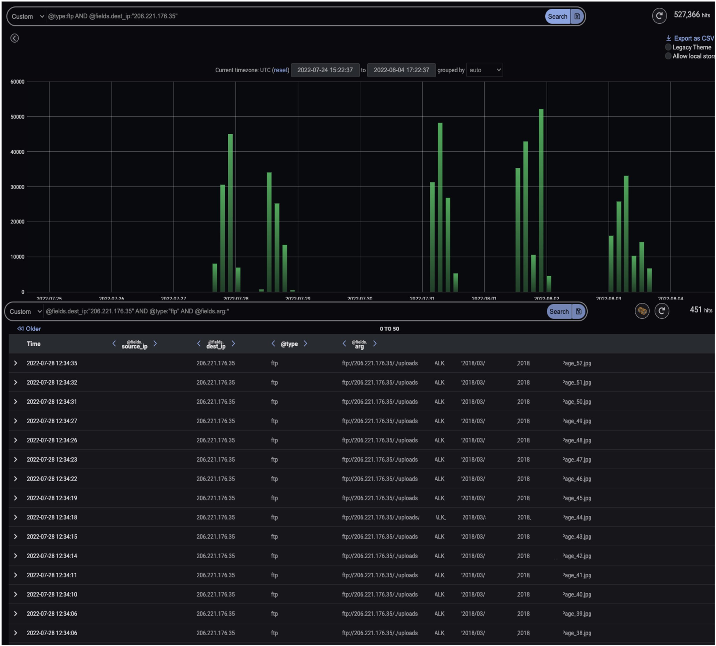 In contrast, this attack displayed several gigabytes of data leaving internal devices including servers that had previously beaconed to Cobalt Strike C2 servers. This data was transferred overtly via FTP, however the attacker still attempted to conceal the activity using ephemeral ports (FTP in EPSV mode). FTP is an effective method for attackers to exfiltrate large files as it is easy to use, organizations often neglect to monitor outbound usage, and it can be shipped through ports that will not be blocked by traditional firewalls [21].