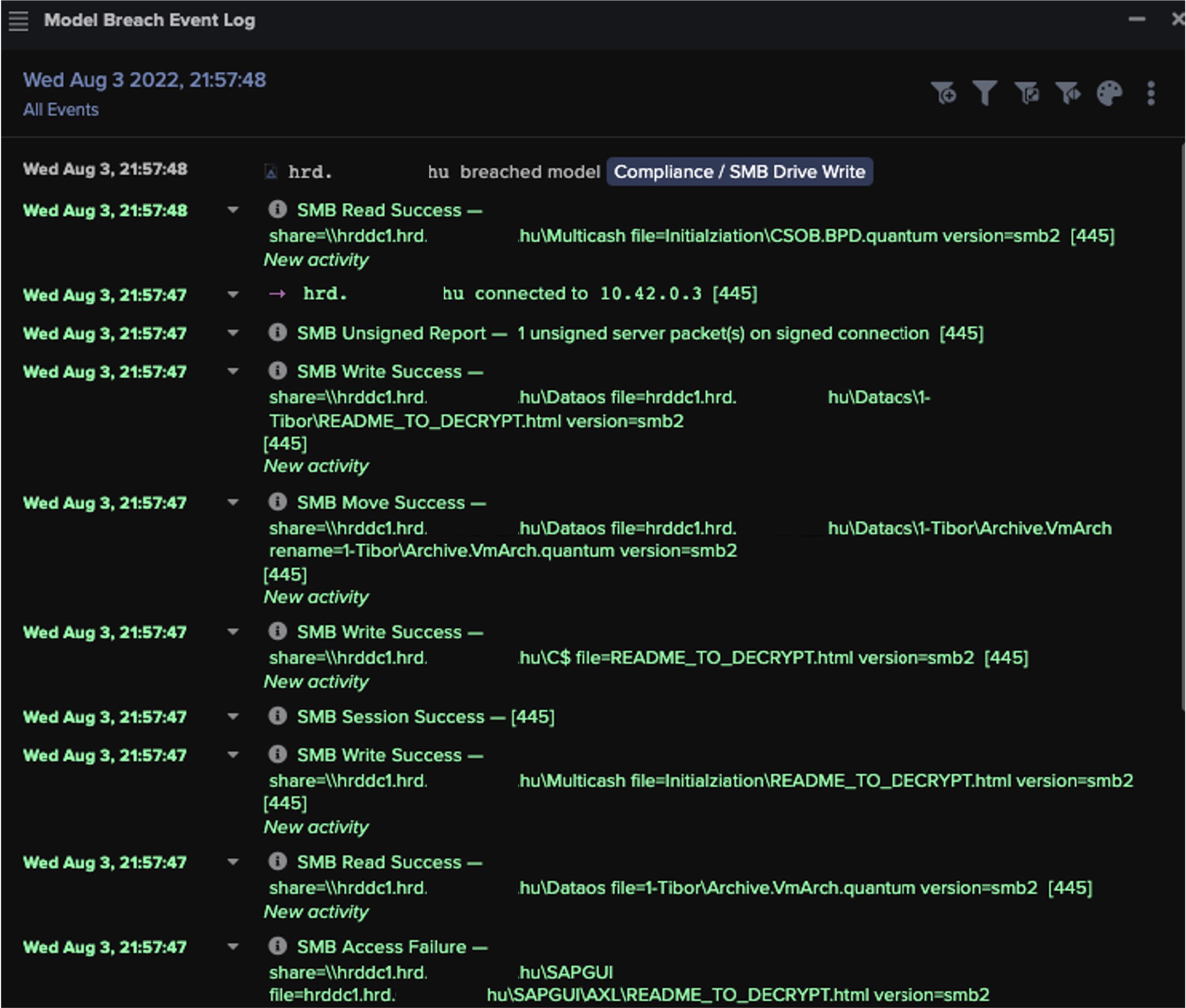 Data was continuously exfiltrated until a week later when the final stage of the attack was achieved and Quantum ransomware was detonated. Darktrace detected the following unusual SMB activity initiated from the attacker-created account that is a hallmark for ransomware (see Figure 7 for example log):