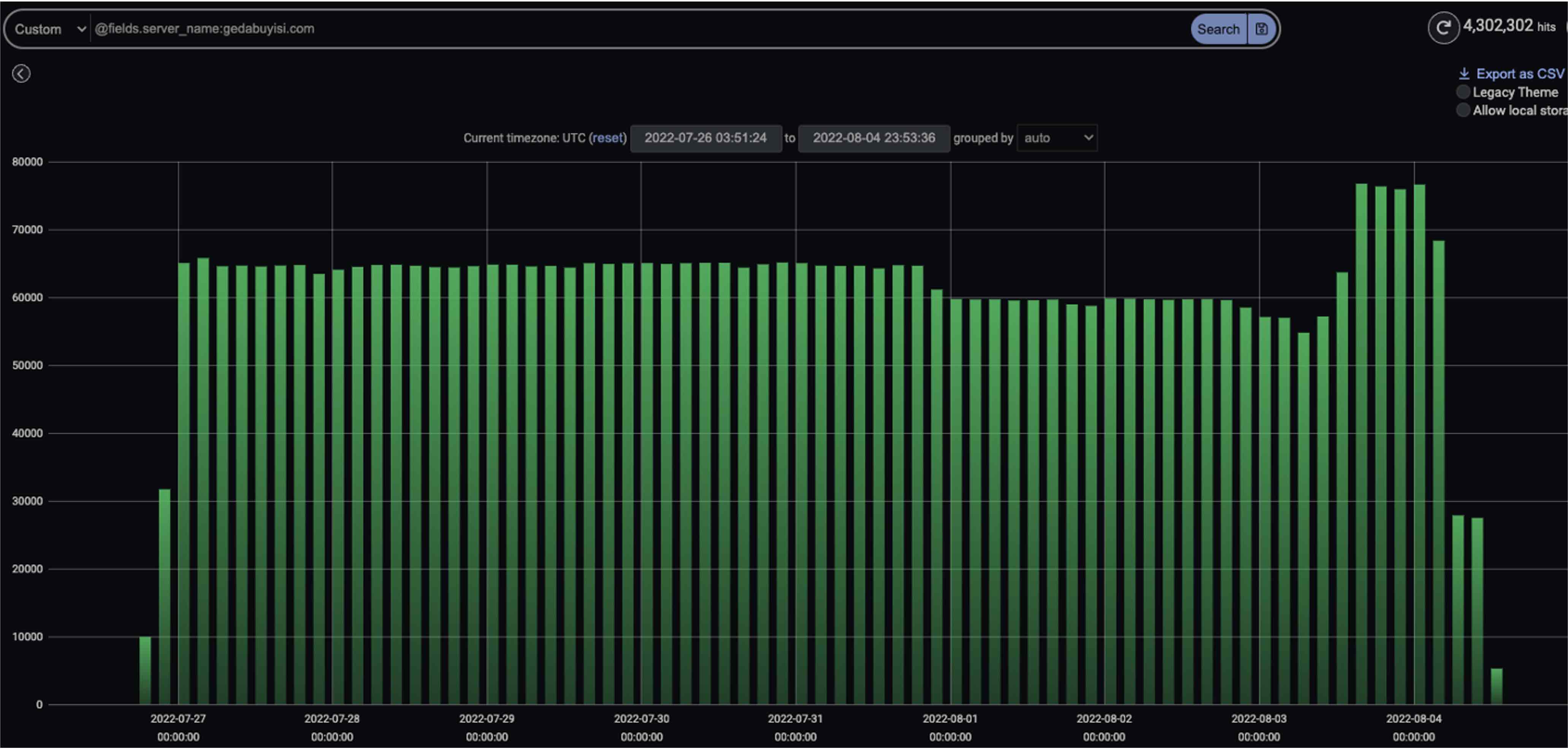 These DLL files likely contained a copy of the malware that injects into legitimate processes such as winlogon, to perform commands that call out to C2 servers [16]. Shortly after the file transfers, the affected domain controllers were also seen beaconing to external endpoints (‘sezijiru[.]com’ and ‘gedabuyisi[.]com’) that OSINT tools have associated with these DLL files [17 & 18]. Moreover, these SSL connections were made using a default client fingerprint for Cobalt Strike [19], which is consistent with the initial delivery method. To illustrate the beaconing nature of these connections, Figure 5 displays the 4.3 million daily SSL connections to one of the C2 servers during the attack. The 100,000 most recent connections were initiated by 11 unique source IP addresses alone.