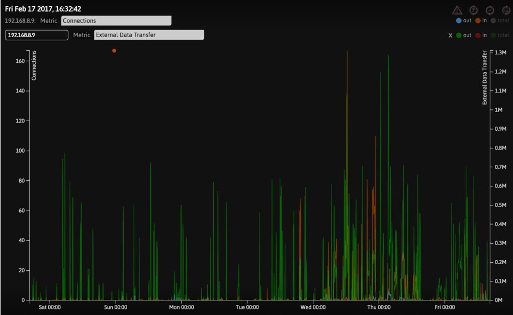 Figure 2: The number of inbound connections on port 161 to one of the devices on port 161 is shown in orange. External data transfer from port 161 are shown in green. Time, top left, is x-axis value at right-hand origin.