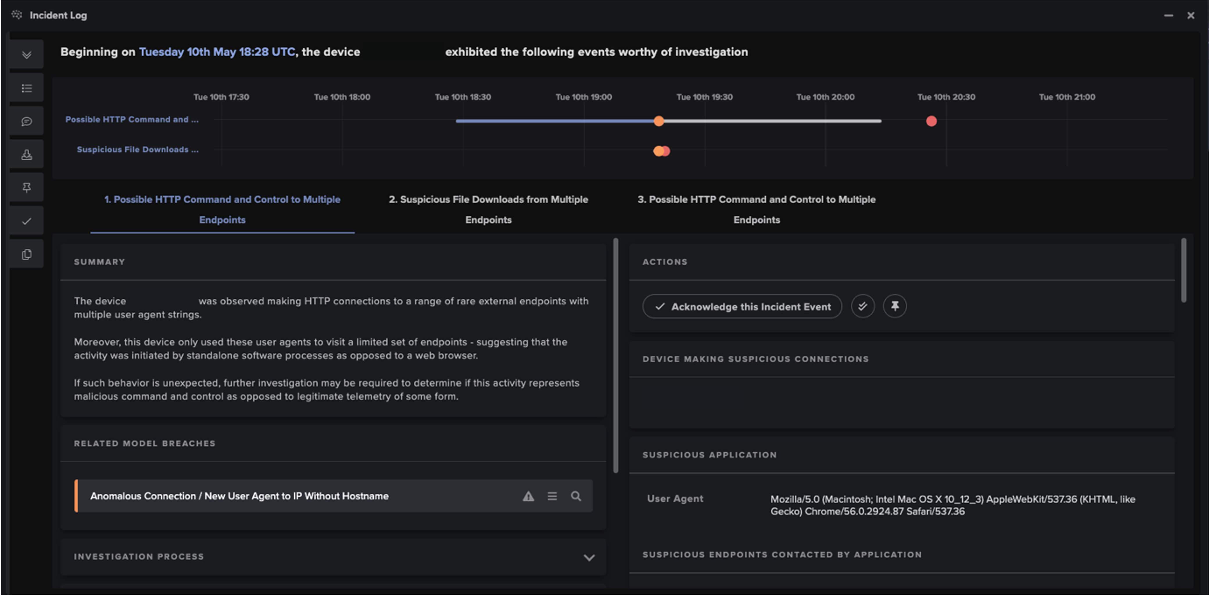 Shortly after, the device made connections to a known Tor relay node. Tor is commonly used as an avenue for C2 communication as it offers a way for attackers to anonymize and obfuscate their activity. It was at this point that the first Proactive Threat Notification (PTN) for this activity occurred. This ensured immediate follow-up investigation from Darktrace SOC and a timeline of events and impacted devices were issued to the customer’s security team directly.