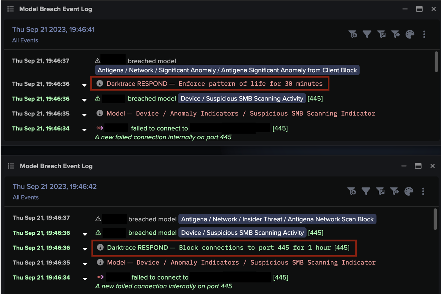 Within seconds of Darktrace's detection of this suspicious SMB scanning activity, Darktrace's Autonomous Response moved to contain the compromise by blocking the device from connecting to port 445 and enforcing its ‘pattern of life’. Darktrace’s Self-Learning AI enables it to learn a device’s normal behavior and recognize if it deviates from this; by enforcing a pattern of life on an affected device, malicious activity is inhibited but the device is allowed to continue its expected activity, minimizing disruption to business operations.