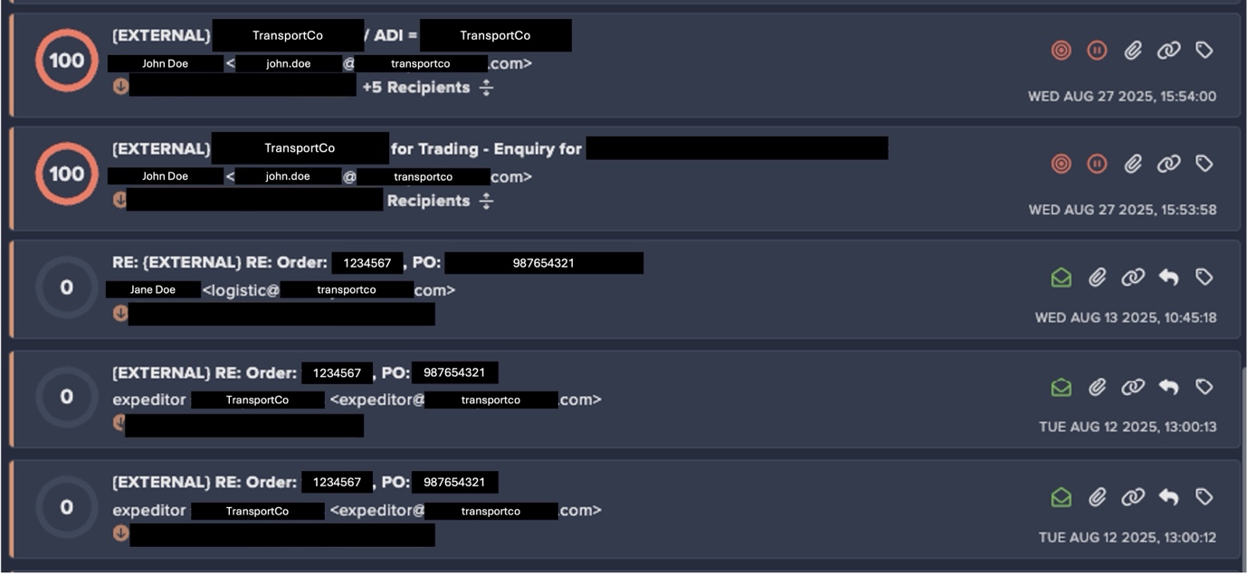 Legitimate messages in the conversation were assigned an Anomaly Score of 0, while the newly inserted malicious emails identified and were flagged with the maximum score of 100.