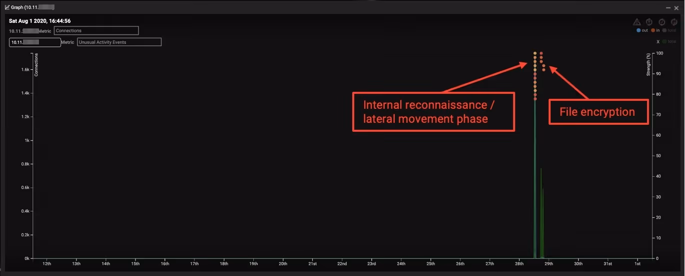 Internal reconnaissance and encryption – sometimes referred to as detonation – took place late at night local time. This may have been strategic on the part of the attackers, as the number of security professionals actively monitoring the network was probably lower, slowing the speed of the organization’s response. Endpoint defenses did not prevent the threat – likely indicating that this was a slightly modified strain of the Eking ransomware that was able to bypass these signature-based tools.