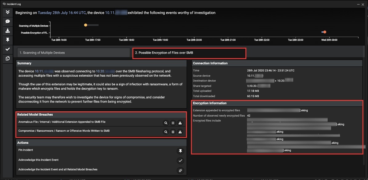 An internal server was infected with Eking ransomware via an attack vector outside of Darktrace’s visibility, most likely an employee clicking a malicious link within an email. Antigena Email would likely have identified suspicious characteristics of the email and stopped it from reaching employees’ inboxes, preventing the threat at the first hurdle. However, in this instance, the customer had only deployed Cyber AI across their network. This still enabled Darktrace’s Immune System to identify lateral movement and encryption activity indicative of ransomware.