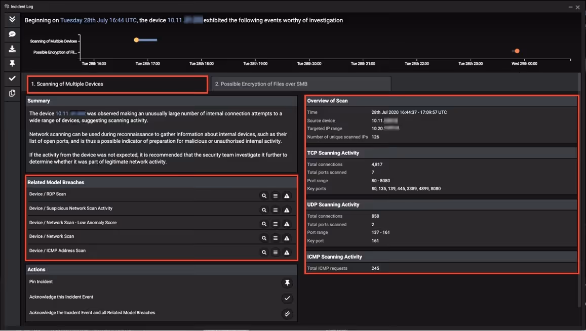 When the first model breach occurred, this triggered Darktrace’s Cyber AI Analyst to launch a real-time investigation into the events as they unfolded. Piecing together the lateral movement and the later encryption, the technology recognized that these separate events were part of a wider security narrative. It surfaced an incident summary and several key metrics for the security team to review and action a response.