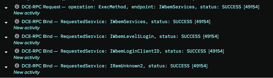 At 23:09:53 UTC on April 30, 2023, the original domain server proceeded to make multiple uncommon WMI calls to a destination server on the same subnet (server01.corp.XXXX). Specifically, the device was observed making multiple RPC calls to IWbem endpoints on the server, which included login and ExecMethod (method execution) commands on the destination device. This destination device later proceeded to conduct additional beaconing activity to C2 endpoints and exfiltrate data.