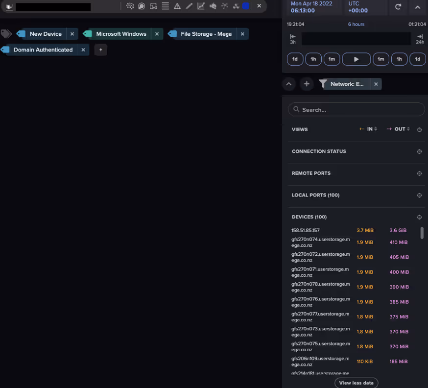 In another case, a device was observed uploading over 16 GiB of data to a rare external endpoint 93.115.27[.]71 over SSH. The endpoint in question was seen in earlier beaconing activity suggesting that this was likely an exfiltration event.