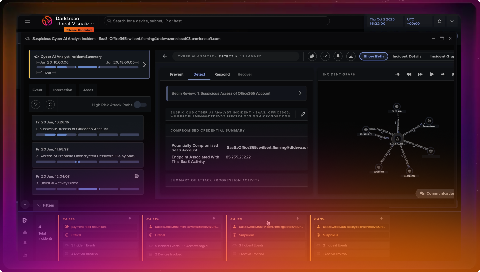 Continuous learning of cyber risk is fed into the detection and response capabilities of the Darktrace ActiveAI Security Platform. Quickly evaluate the potential impact to affected assets during incidents and strengthen response along your most critical attack paths.
