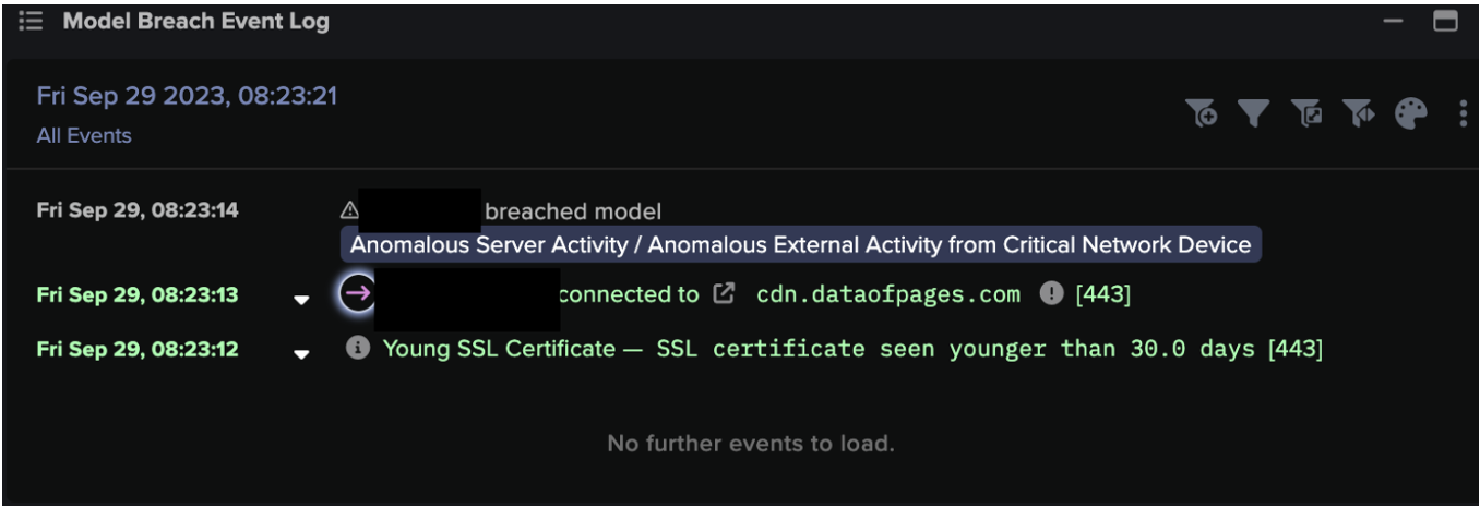 On September 29, 2023, a device on a separate customer’s network was observed connecting to the hostname ‘cdn[.]dataofpages[.]com’, one of the three new Balada Injector domains identified as part of the fifth pattern of activity outlined above, using a new SSL certificate via port 443. Multiple open-source intelligence (OSINT) vendors flagged this domain as malicious and associated with Balada Injector malware [9].
