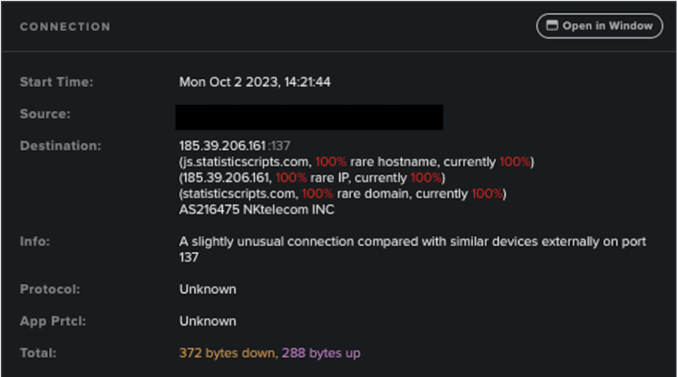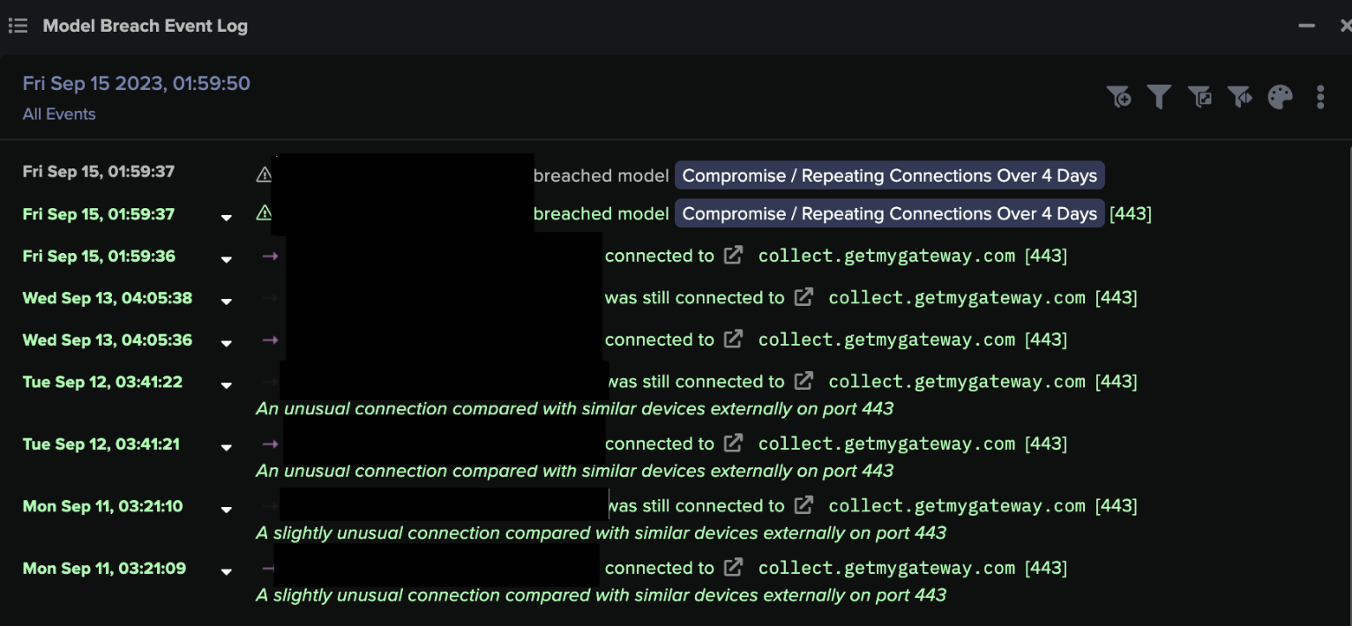 In a separate case observed on September 14, Darktrace identified a device on another environment connecting to the domain ‘collect[.]getmygateway[.]com’ with the IP 88.151.192[.]254. No other device on the customer’s network had visited this endpoint previously, and the device in question was observed repeatedly connecting to it via port 443 over the course of four days. While this specific hostname had not been linked with a specific activity pattern of Balada Injector, it was reported as previously associated with the malware in September 2023 [2].