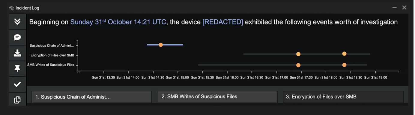 RESPOND constantly re-evaluates threats as attacks unfold. Had the first stage still been successful, it would have continued to take targeted action at each corresponding stage of this attack. RESPOND models would have alerted to block the external connections to C2 servers over port 443, the outbound exfil attempts and crucially the SMB write activity over port 445 related to encryption.