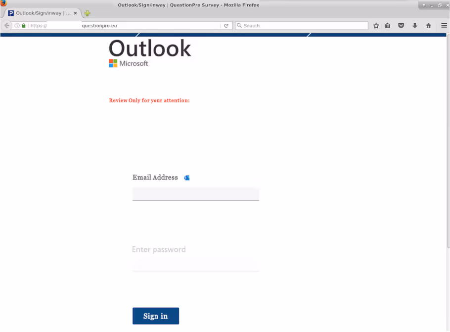 On February 3, the attacker sent a phishing email to the corporate account of an employee. The email was sent from the corporate account of an employee at a company with business ties to the victim enterprise. It is likely that the attacker had compromised this account prior to sending the phishing email from it. The phishing email in question claimed to be an overdue payment reminder. Within the email, there was a link hidden behind the display text “view invoice”. The hostname of the phishing link’s URL was a subdomain of questionpro[.]eu — an online survey platform. The page referred to by the URL was a fake Microsoft Outlook login page.
