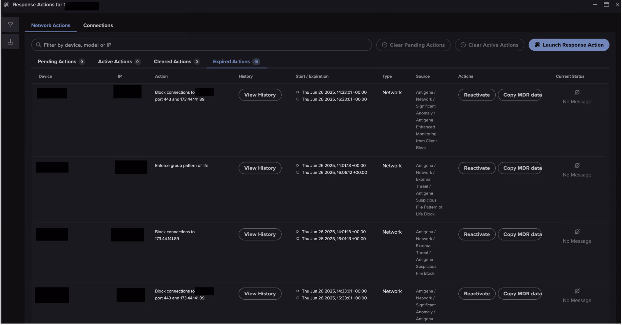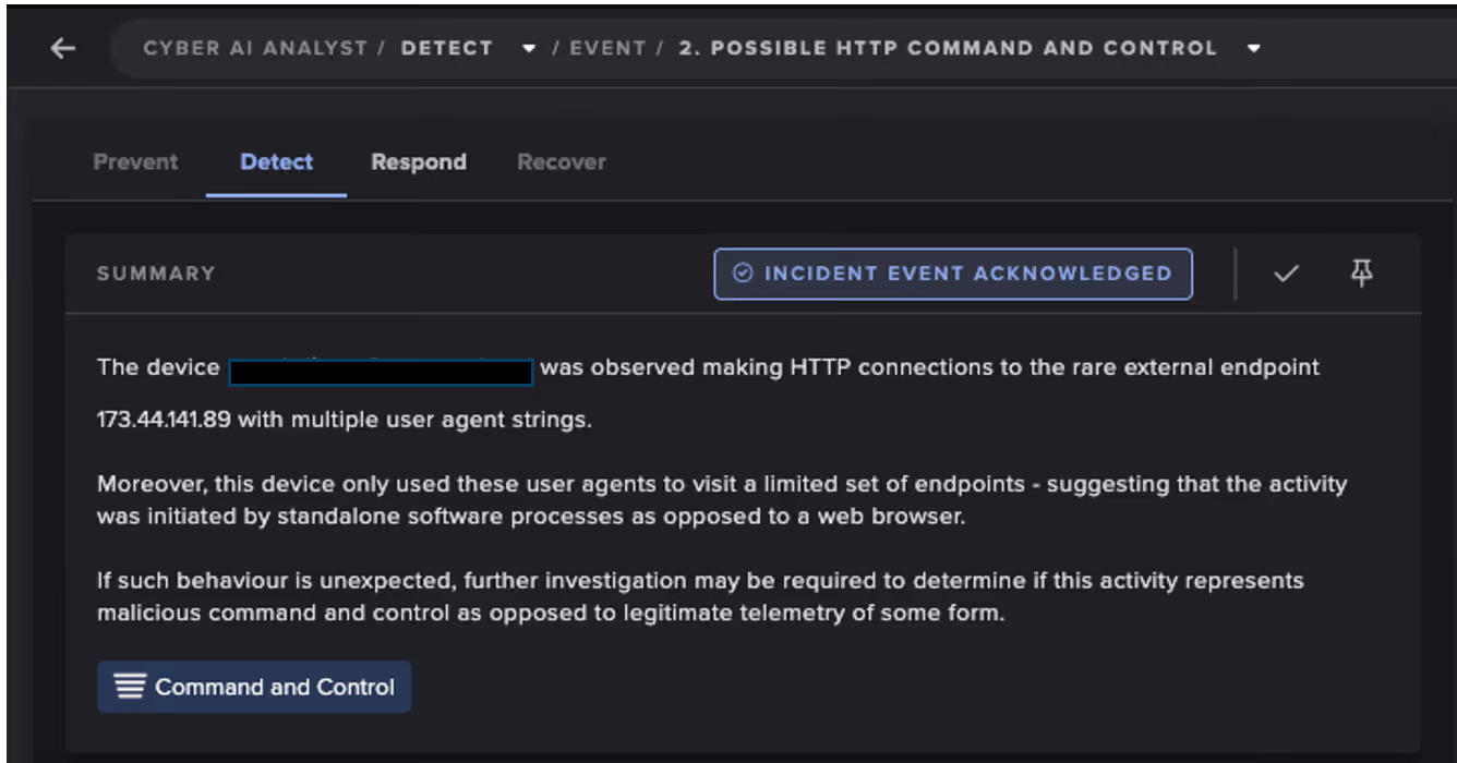 Fortunately, Darktrace’s Autonomous Response capability was fully configured, enabling it to take immediate action against the offending device by blocking any further connections external to the malicious endpoint, 173.44.141[.]89. Additionally, Darktrace enforced a ‘group pattern of life’ on the device, restricting its behavior to match other devices in its peer group, ensuring it could not deviate from expected activity, while also blocking connections over 443, shutting down any unwanted internal scanning.