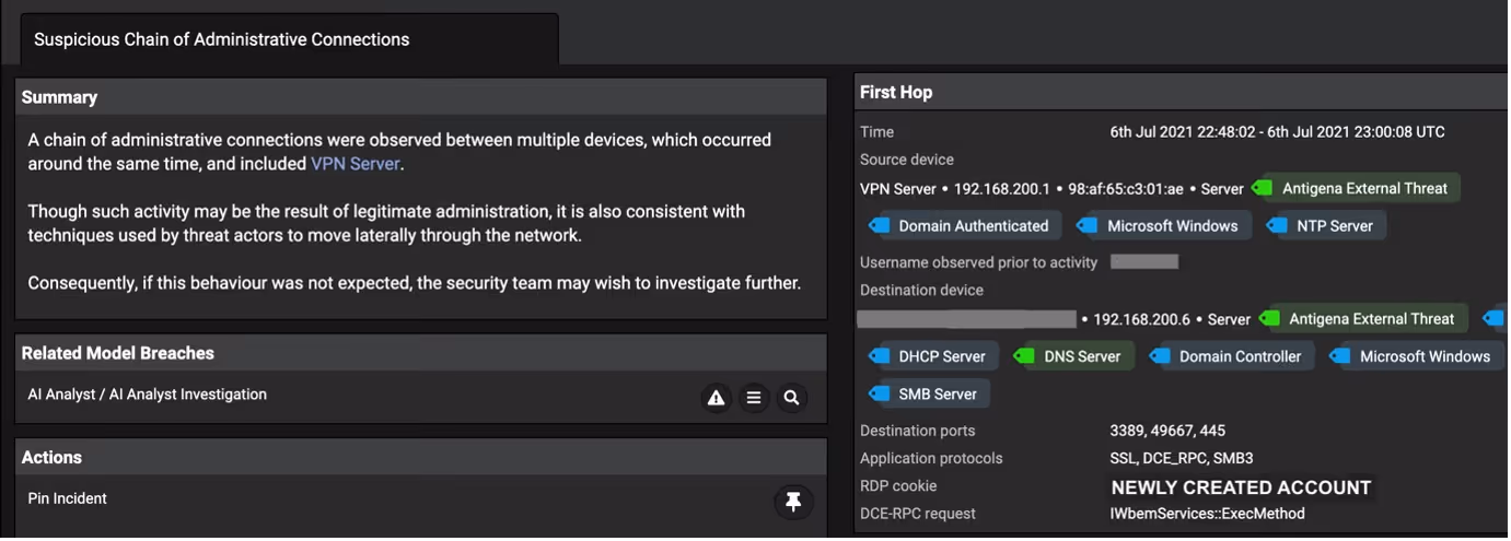 Following successful bruteforcing on the VPN, the malicious actor created a new user account which was then added to an administrative group on an Active Directory server. This new user account was subsequently used in an RDP session to an internal Domain Controller. Cyber AI Analyst picked up on the unusual nature of these administrative connections in comparison to normal activity for these devices and alerted on it (Figure 2).