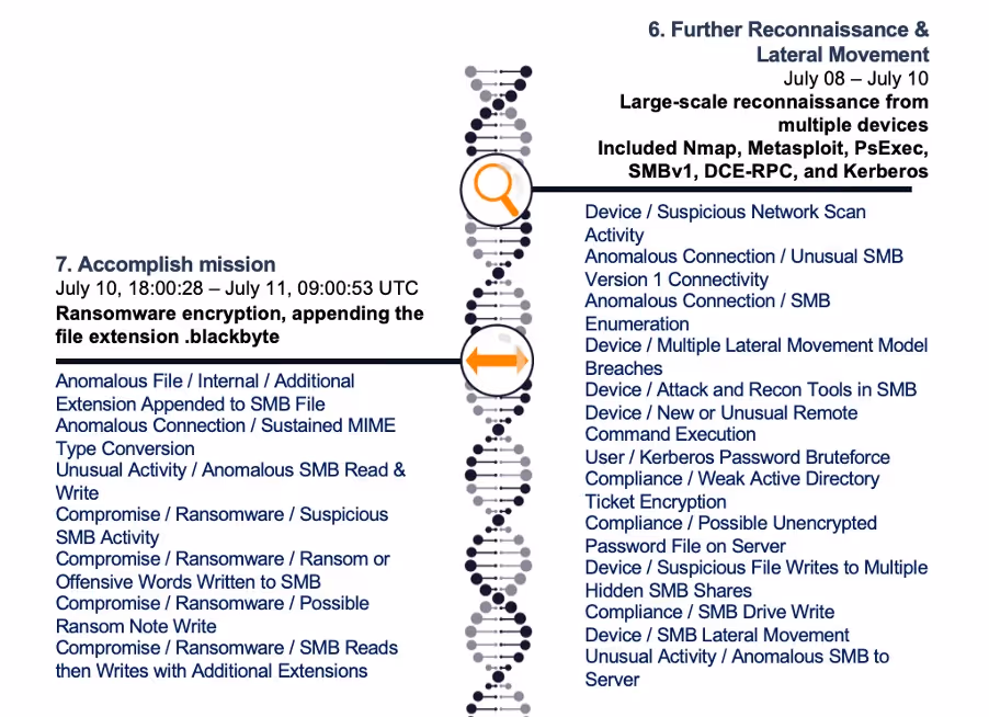 On the 10th of July, ransomware was deployed. File encryption occurred, with the extension ‘.blackbyte’ being appended to multiple files. At the time there were no OSINT references to this file extension or ransomware type, therefore any signature-based solution would have struggled to detect it. It is now apparent that BlackByte ransomware had only appeared a few weeks earlier and, since then, the Ransomware-as-a-Service group has been attacking businesses and critical infrastructure worldwide [3]. A year later they still pose an active threat.