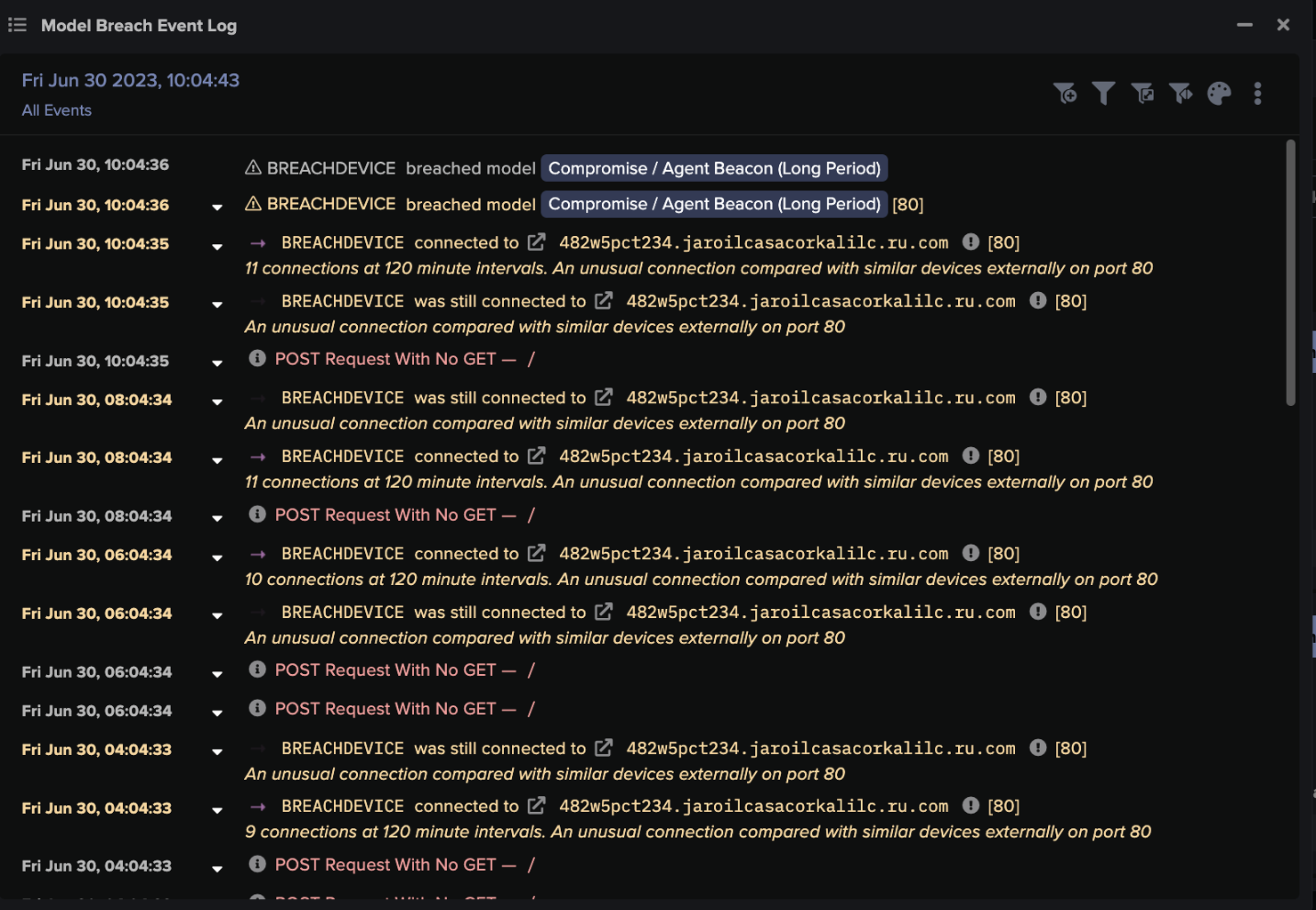 On June 23, 2023, Darktrace DETECT observed the first instance of unusual activity being performed by the affected desktop device, namely regular HTTP POST requests to a suspicious domain, indicative of command-and-control (C2) beaconing activity. The domain used an unusual Top-Level Domain (TLD), with a plausibly meaningful (in Portuguese) second-level domain and a seemingly random 11-character third-level domain, “dn00x1o0f0h.puxaofolesanfoneiro[.]quest”.