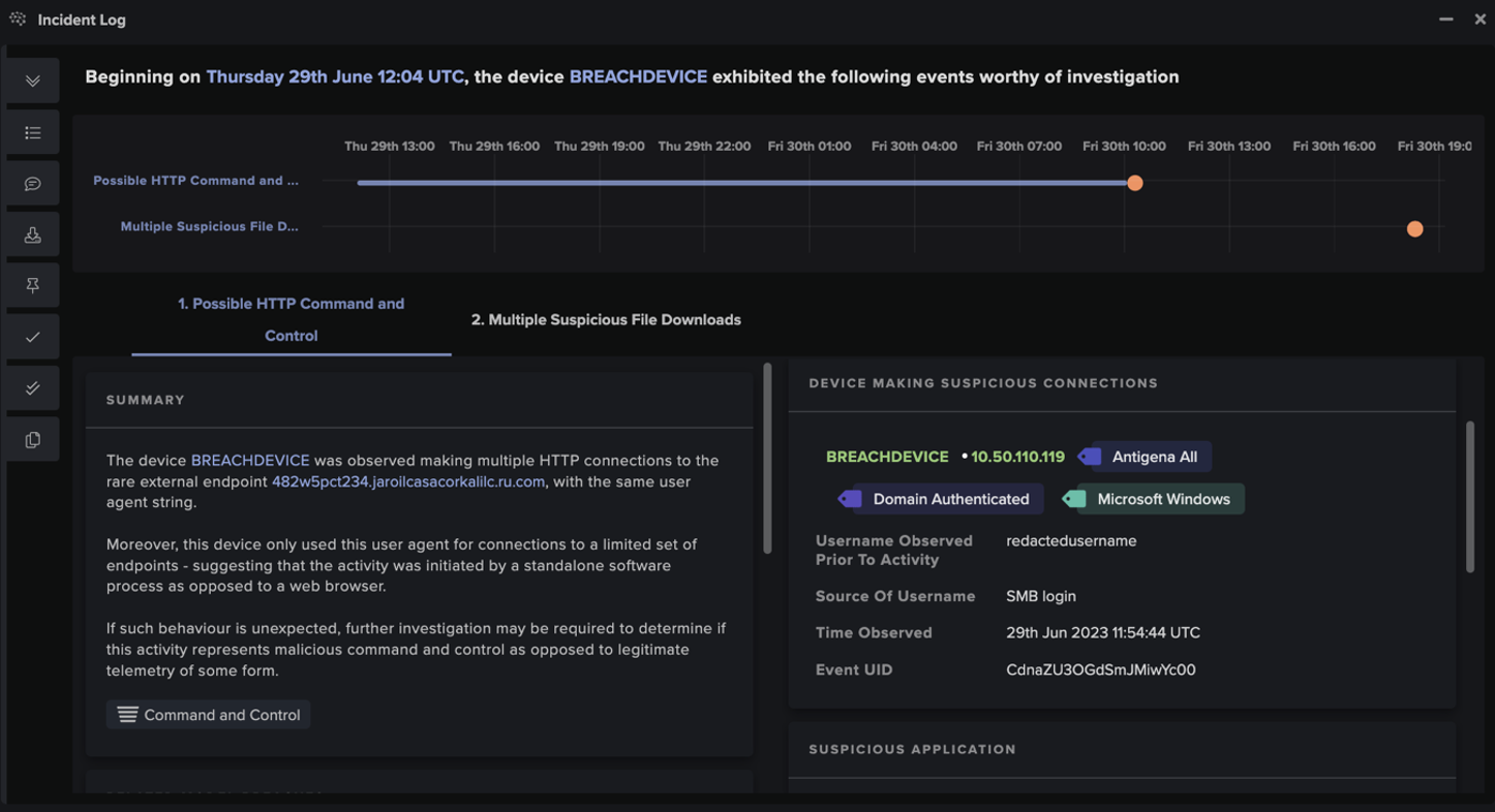 In addition to this, Cyber AI Analyst™ launched an investigation into the ongoing compromise and was able to connect the anomalous HTTP connections to the subsequent suspicious file downloads, viewing them as one incident rather than two isolated events. AI Analyst completed its investigation in just three minutes, upon which it provided a detailed summary of events of the activity, further aiding the customer’s remediation process.