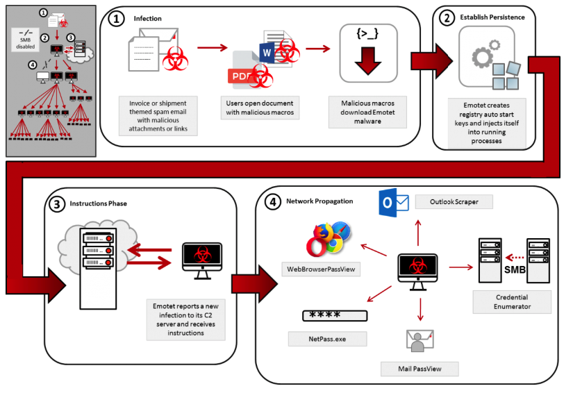 Emotet is a highly sophisticated malware with a modular architecture, installing its main component first before delivering additional payloads. Further increasing its subtlety is the fact that Emotet is considered to be ‘polymorphic malware’, since it constantly changes its identifiable features to evade detection by antivirus products. And, as will be subsequently discussed in greater detail, Emotet has advanced persistence techniques and worm-like self-propagation abilities, which render it uniquely resilient and dangerous.