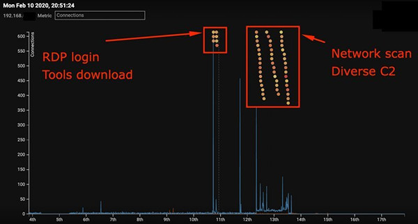 The RDP server started making a lot of highly anomalous and rare connections to external destinations. It is inconclusive if all of the below services, IPs, and domains were used for C2 purposes only, but they are linked with high-confidence to the attacker’s activities: