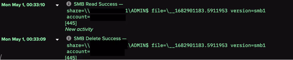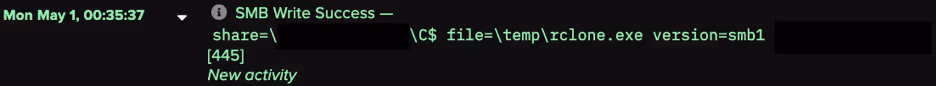 Similarly, beginning on May 1, 2023, at 00:11:09 UTC, the device desktop_02.corp.XXXX made multiple WMI requests to two additional devices, one server and one desktop, within the same subnet as the original domain controller. During this time, desktop_02.corp.XXXX also utilized SMBv1, an outdated and typically non-compliant version communication protocol, to write the file rclone.exe to the same two destination devices. Rclone.exe, and its accompanying bat file, is a command-line tool developed by IT provider Rclone, to perform file management tasks. During this time, Darktrace also observed the device reading and deleting an unexpected numeric file on the ADMIN$ of the destination server, which may represent additional defense evasion techniques and tool staging.