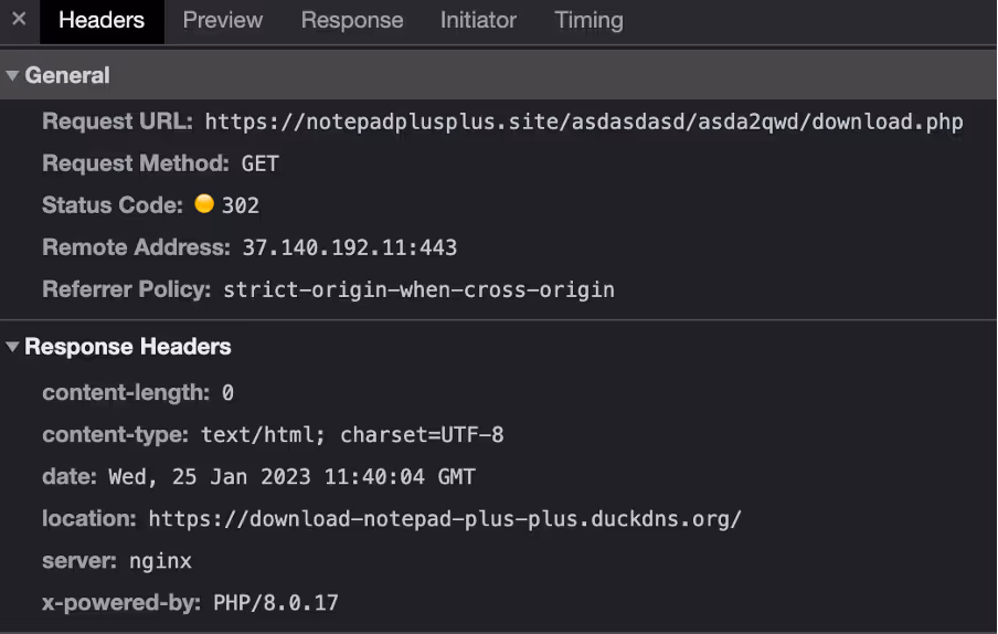 When clicking on Download, regardless of the version selected, the traffic is then redirected to https://download-notepad-plus-plus.duckdns.org/, and a .zip file with name “npp.Installer.x64.zip” is downloaded.