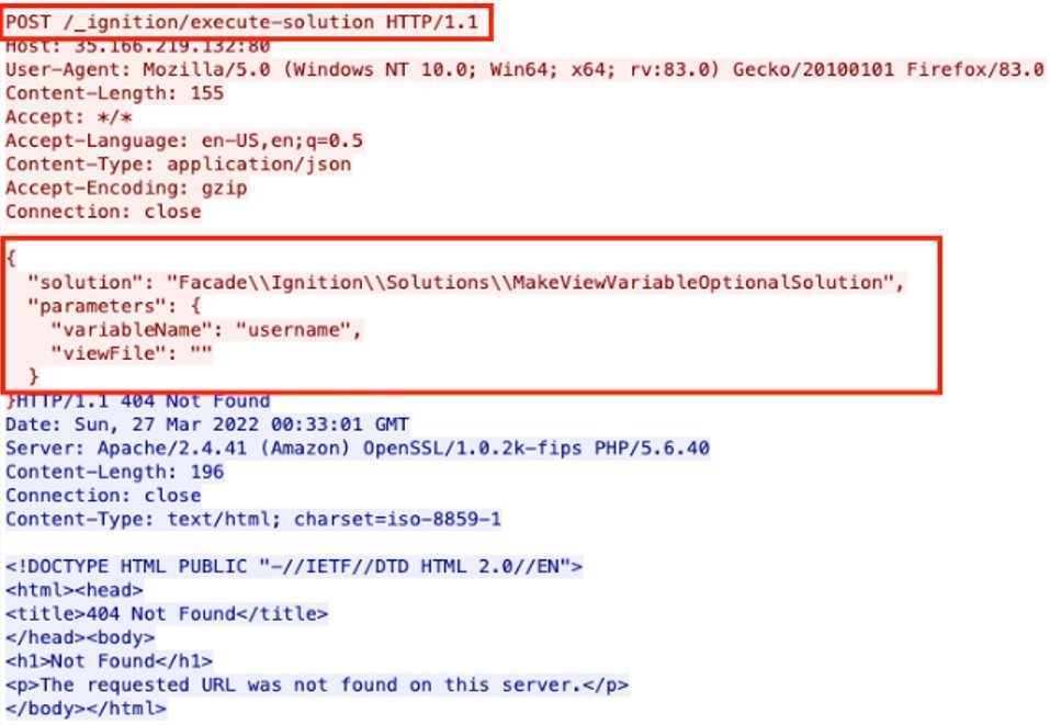 - Through March, the device also made around 5,500 HTTP POSTs with the URI ‘/_ignition/execute-solution’ to at least 99 unique public IPs. This appears related to CVE-2021-3129, which allows unauthenticated remote attackers to execute arbitrary code using debug mode with Laravel, a PHP web application framework in versions prior to 8.4.2.15 The POST request below makes the variable ‘username’ optional, and the ‘viewFile’ parameter is empty, as a test to see if the endpoint is vulnerable.16